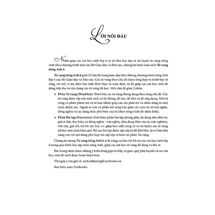 Nhằm giúp các em học sinh lớp 6 có tài liệu học tập và ôn luyện từ vựng tiếng Anh theo chương trình mới của Bô Giáo dục và Đào tạo, chúng tôi biên soạn sách Từ vựng tiếng Anh 6.