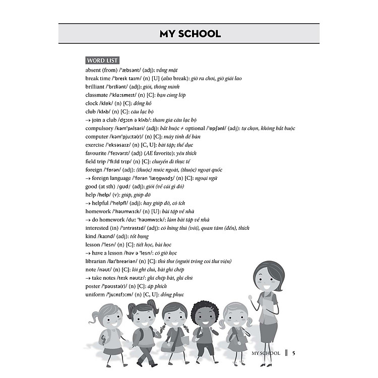– Phần Từ vựng (World list): Trình bày các từ vựng thông dụng theo từng chủ đề. Các từ vựng được sắp xếp một cách có hệ thống, dễ tìm, dễ nhớ và dễ ứng dụng. Mỗi từ vựng có phần phiên âm và từ loại nhằm giúp các em phát âm và nhận dạng từ một cách chính sác. Ngoài ra còn có phần mở rộng bao gồm các cụm từ, từ trái nghĩa, đồng nghĩa và các dạng thức phổ biến của từ (theo từng trình độ nhất định).