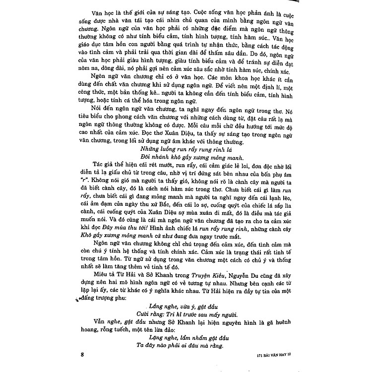 Cuốn sách là tập hợp 171 bài văn hay được các tác giả biên soạn và tuyển chọn. Bao gồm các thể loại văn trong chương trình Ngữ Văn lớp 12.