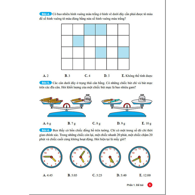 – Phần một bao gồm hệ thống các câu hỏi trắc nghiệm và tự luận. Bên cạnh các dạng toán cơ bản, bám sát chương trình giáo dục phổ thông 2018, các em còn được tiếp cận rất nhiều dạng bài phong phú và hấp dẫn, thường xuất hiện trong các kì thi Toán quốc tế ở bậc Tiểu học. Chúng tôi sắp xếp một cách tương đối câu hỏi trong cuốn sách theo thứ tự từ cơ bản, gợi mở đến nâng cao để luôn khuyến khích học sinh tiếp tục vượt qua những thử thách ở mức độ cao hơn mỗi khi hoàn thành được một nhiệm vụ trước đó. Tuy nhiên, các em không nhất thiết phải làm theo thứ tự, mà có thể chọn một cách sắp xếp phù hợp với