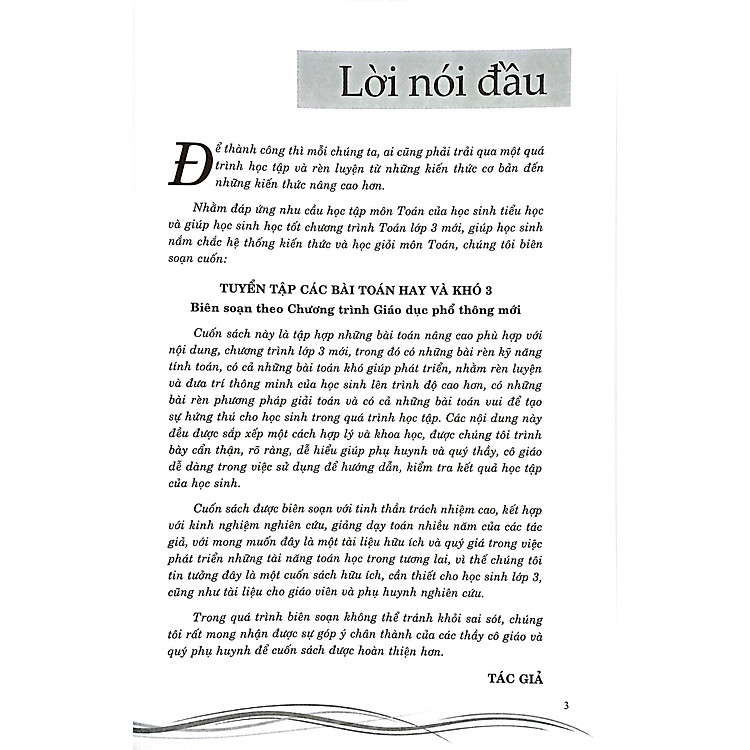 Cuốn sách được biên soạn với tinh thần trách nhiệm cao, kết hợp với kinh nghiệm nghiên cứu, giảng dạy toán nhiều năm của các tác giả, với mong muốn đây là một tài liệu hữu ích và quý giá trong việc phát triển những tài năng toán học trong tương lai, vì thế chúng tôi tin tưởng đây là một cuốn sách hữu ích, cần thiết cho học sinh lớp 3, cũng như tài liệu cho giáo viên và phụ huynh nghiên cứu.