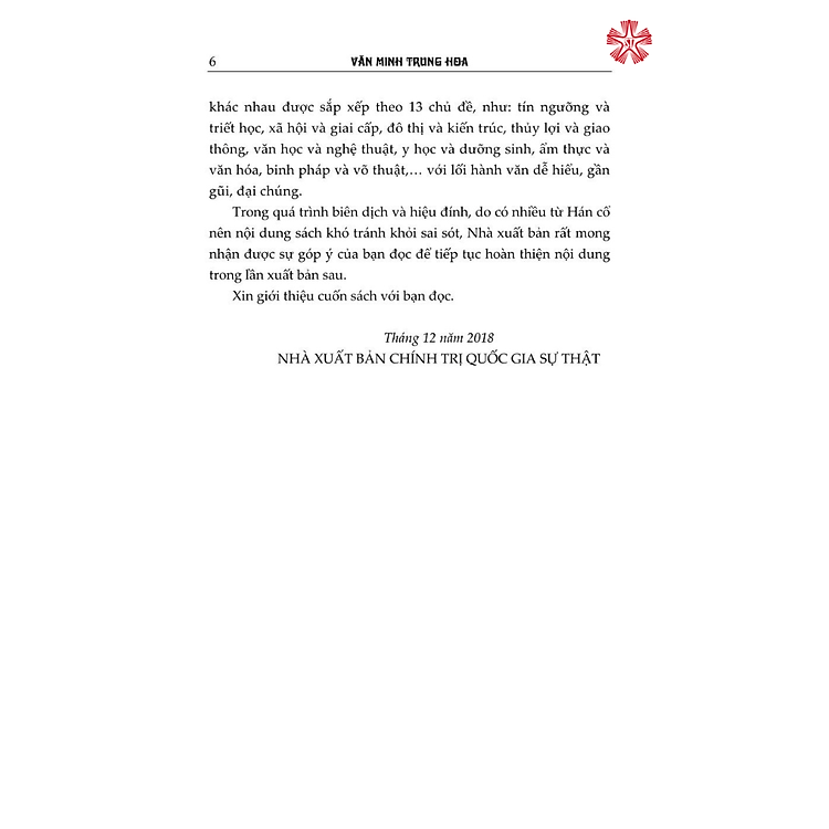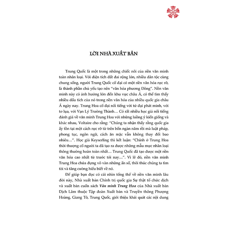 Cuốn sách “Văn minh Trung Hoa” thực sự là một tác phẩm tuyệt vời dành cho những ai đam mê tìm hiểu về nền văn minh lâu đời và phong phú của Trung Quốc. Tác phẩm này không chỉ giới thiệu về lịch sử, văn hóa mà còn đi sâu vào các lĩnh vực như tín ngưỡng, triết học, xã hội, kiến trúc, và nghệ thuật.