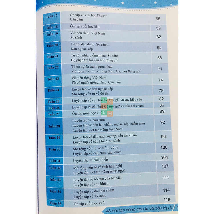 Phần 1: BÀI TẬP. Phần này được biên soạn theo từng tuần tương ứng với các tuần học trong chương trinh sách giáo khoa Tiếng Việt 3 – Cánh diều. Hệ thống bài tập được biên soạn theo mục tiêu của từng tuần/ bài học, với ngữ liệu phong phú, mới mẻ, được chọn lọc cẩn thận nhằm giúp các em học sinh cũng cố và nâng cao kiến thức về tử và câu. Từ đó, các em sẽ được rèn luyện và phát triển các kĩ năng dùng tử, đặt câu, sử dụng dấu câu và các biện pháp tu từ một cách hiệu quả.