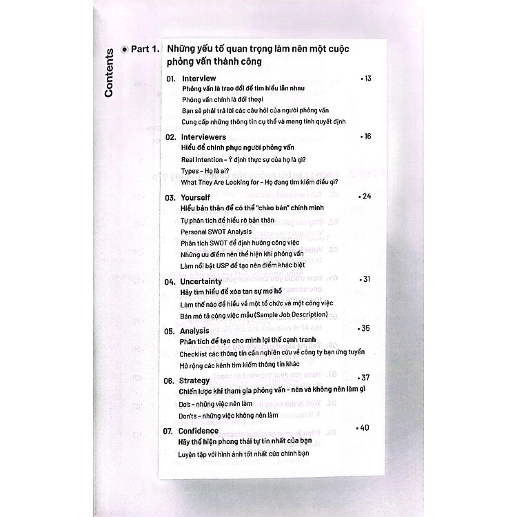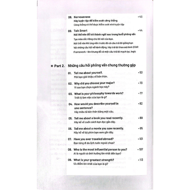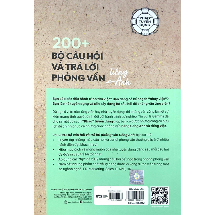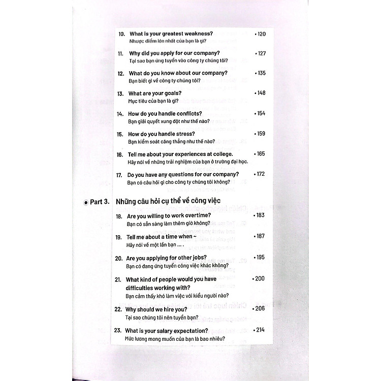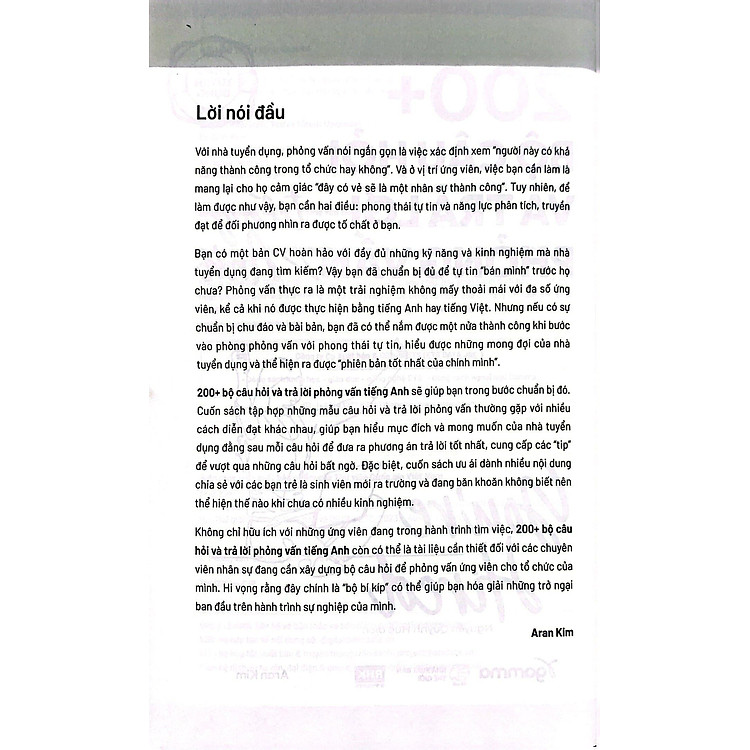 200+ bộ câu hỏi và trả lời phỏng vấn tiếng Anh sẽ giúp bạn trong bước chuẩn bị đó. Cuốn sách tập hợp những mẫu câu hỏi và trả lời phỏng vấn thường gặp với nhiều cách diễn đạt khác nhau, giúp bạn hiểu mục đích và mong muốn của nhà tuyển dụng đằng sau mỗi câu hỏi để đưa ra phương án trả lời tốt nhất, cung cấp các “tip” để vượt qua những câu hỏi bất ngờ. Đặc biệt, cuốn sách ưu ái dành nhiều nội dung chia sẻ với các bạn trẻ là sinh viên mới ra trường và đang băn khoăn không biết nên thể hiện thế nào khi chưa có nhiều kinh nghiệm. Không chỉ hữu ích với những ứng viên đang trong hành trình tìm việc, 200+ bộ câu hỏi và trả lời phỏng vấn tiếng Anh còn có thể là tài liệu cần thiết đối với các chuyên viên nhân sự đang cần xây dựng bộ câu hỏi để phỏng vấn ứng viên cho tổ chức của mình.