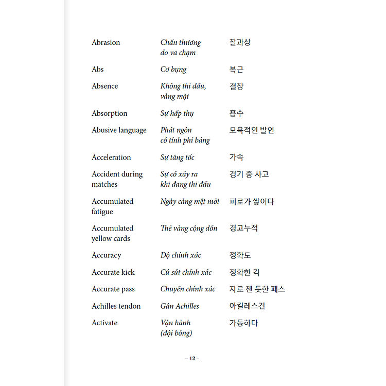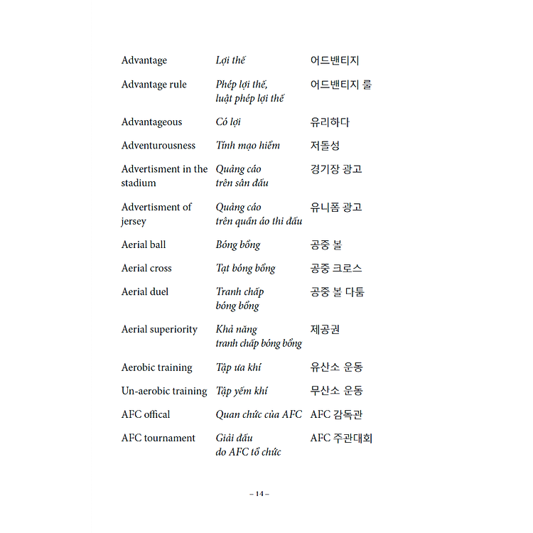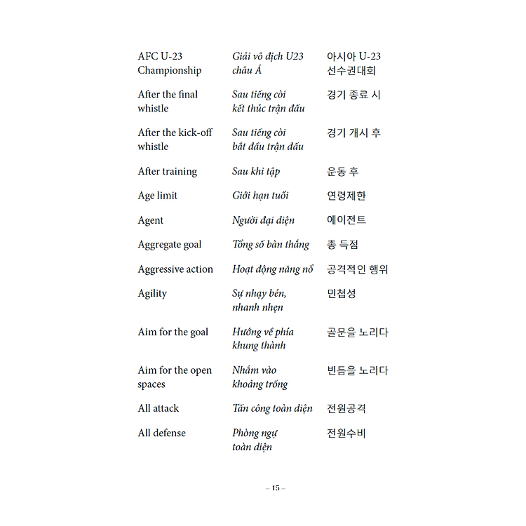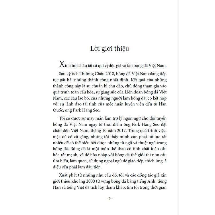 Cuốn sách của tập thể tác giả Lê Huy Khoa, Lê huy Phúc, Lee Youngsub (Chủ biên) và do cầu thủ Lương Xuân Trường hiệu đính, giới thiệu đến bạn đọc khoảng 2000 từ vựng bóng đá bằng tiếng Anh, tiếng Việt, tiếng Hàn