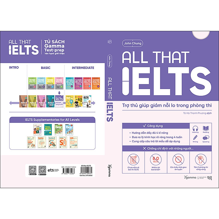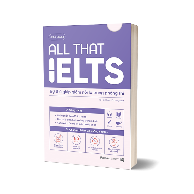 All that IELTS – Trợ thủ giúp giảm nỗi lo trong phòng thi là cuốn sách hướng dẫn toàn diện dành cho những ai chuẩn bị tham gia kì thi IELTS mà vẫn còn thiếu tự tin. Sách đặc biệt hữu ích cho những người có ít thời gian ôn luyện, không đặt mục tiêu điểm quá cao, dễ bị căng thẳng trong phòng thi. Với phương pháp tiếp cận thực dụng, sách gói gọn bốn kĩ năng: Writing, Reading, Listening và Speaking trong một cuốn sách, cung cấp cho người học những kiến thức tổng quát và kĩ năng cần thiết để chinh phục từng phần thi.
