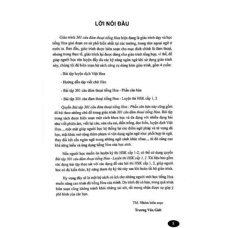 Hy vọng đây sẽ là một bộ sách có ích cho những người mới học tiếng Hoa muốn nâng cao trình độ tiếng Hoa của mình. Do trình độ có hạn, trong quá trình biên soạn cũng không tránh khỏi những sai sót, rất mong nhận được sự góp ý phê bình của các bạn.