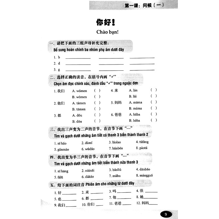 - Các dạng bài tập đa dạng như viết phiên âm, sửa câu sai, và luyện dịch Việt-Hoa.