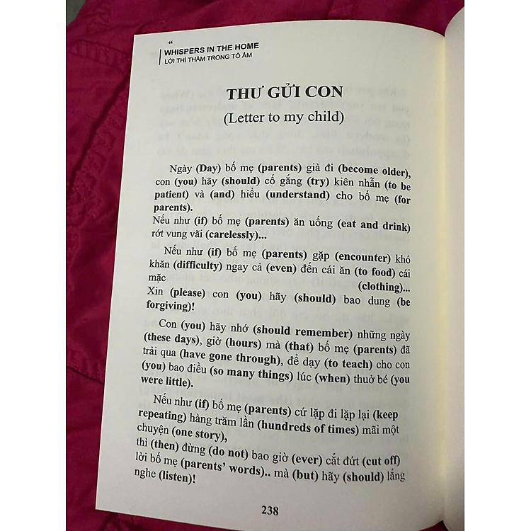 “Lời Thì Thầm với Cha” không chỉ là một cuốn sách dành cho những ai muốn hoài niệm về người cha thân yêu, mà còn là một công cụ hữu ích giúp bạn học tiếng Anh một cách hiệu quả. Cuốn sách được trình bày theo hình thức song ngữ xen kẽ, nghĩa là mỗi đoạn văn bằng tiếng Việt sẽ đi kèm với một đoạn tiếng Anh tương ứng. Cách sắp xếp này giúp người đọc dễ dàng so sánh, đối chiếu và ghi nhớ từ vựng cũng như cách diễn đạt một cách tự nhiên.