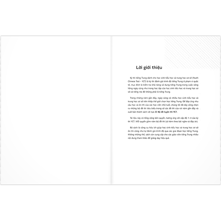 Ngày nay, rất nhiều quốc gia và khu vực trên thế giới có ngôn ngữ mẹ đẻ không phải tiếng Trung đã đưa ngôn ngữ này vào hệ thống giáo dục quốc dân. Vì vậy, số học sinh bậc tiểu học và trung học ở những nơi đó theo học tiếng Trung có xu hướng ngày càng tăng. Để giúp các em làm tốt bài thi YCT (Youth Chinese Test) – bài kiểm tra chuẩn ở cấp độ quốc tế về trình độ tiếng Trung, chúng tôi đã biên soạn sách Bộ đề luyện thi YCT.