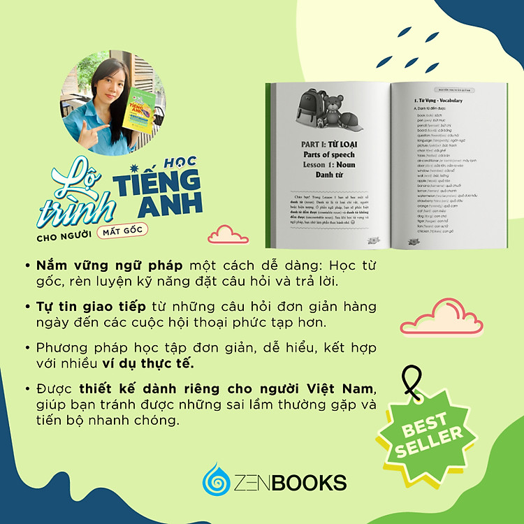 Mô tả: Lộ Trình Học Tiếng Anh Cho Người Mất Gốc – The English Journey của Nguyễn Thị Xuân Quỳnh là cuốn sách thiết kế dành riêng cho người mất gốc tiếng Anh. Với 4 chương sách tương ứng 4 chặng học, sách cung cấp kiến thức cơ bản (từ loại, các thì căn bản, câu hỏi Yes/No và Wh-), 500 câu hỏi giao tiếp thông dụng, hơn 300 bài tập kèm đáp án chi tiết, và 37 video bài giảng luyện nghe, đọc. Phương pháp Step-By-Step ngắn gọn, dễ hiểu, đúng trọng tâm, giúp người học thoải mái và nắm chắc kiến thức. Quà tặng kèm gồm bộ video bài giảng và sổ học từ vựng.
