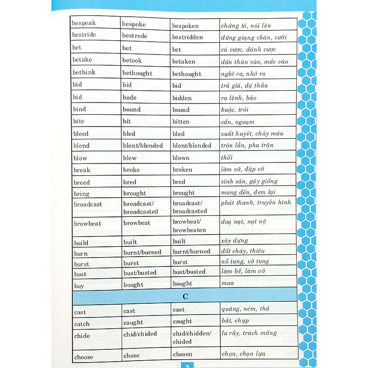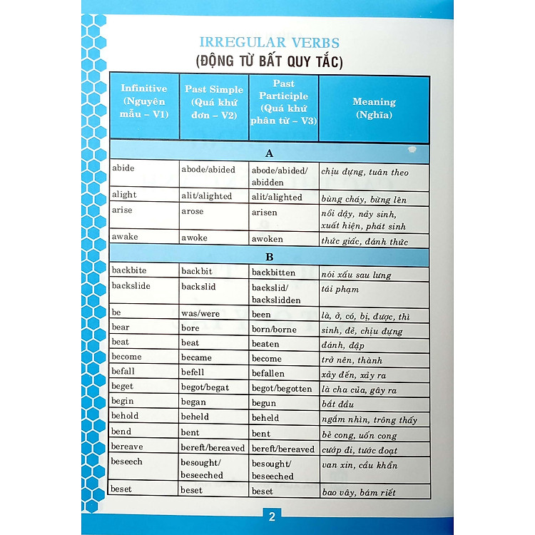 - Bảng động từ: Cung cấp bảng động từ bất quy tắc thông dụng sắp xếp theo thứ tự Alphabet với phiên âm rõ ràng.