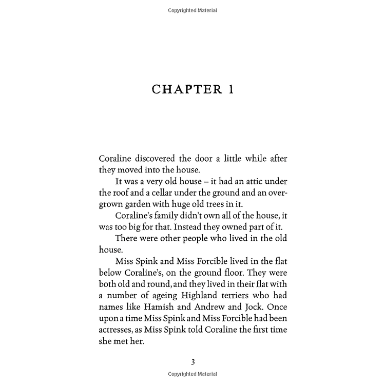 Có điều gì đó kỳ lạ về ngôi nhà mới của Coraline. Không phải sương mù, hay con mèo luôn theo dõi cô, cũng không phải những dấu hiệu nguy hiểm mà những người hàng xóm của Coraline, cô Spink và cô Forcible đọc được trong lá trà. Đó là ngôi nhà kia – ngôi nhà nằm sau cánh cửa cũ trong phòng khách. Hai người cha mẹ khác với đôi mắt đen nhánh và làn da sần sùi đang đợi Coraline cùng họ sống ở căn nhà đó. Và họ muốn cô ở lại với họ mãi mãi. Cô ấy biết rằng nếu cô ấy mạo hiểm đi qua cánh cửa đó, cô ấy có thể sẽ không bao giờ quay lại.
