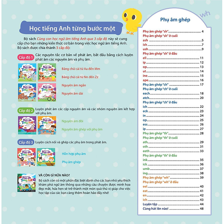 - Bộ sách “Mua Cùng Con Học Ngữ Âm Tiếng Anh Qua 3 Cấp Độ – Phụ Âm Ghép” giúp trẻ em nắm vững ngữ âm tiếng Anh.