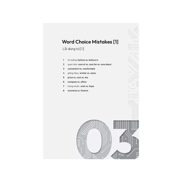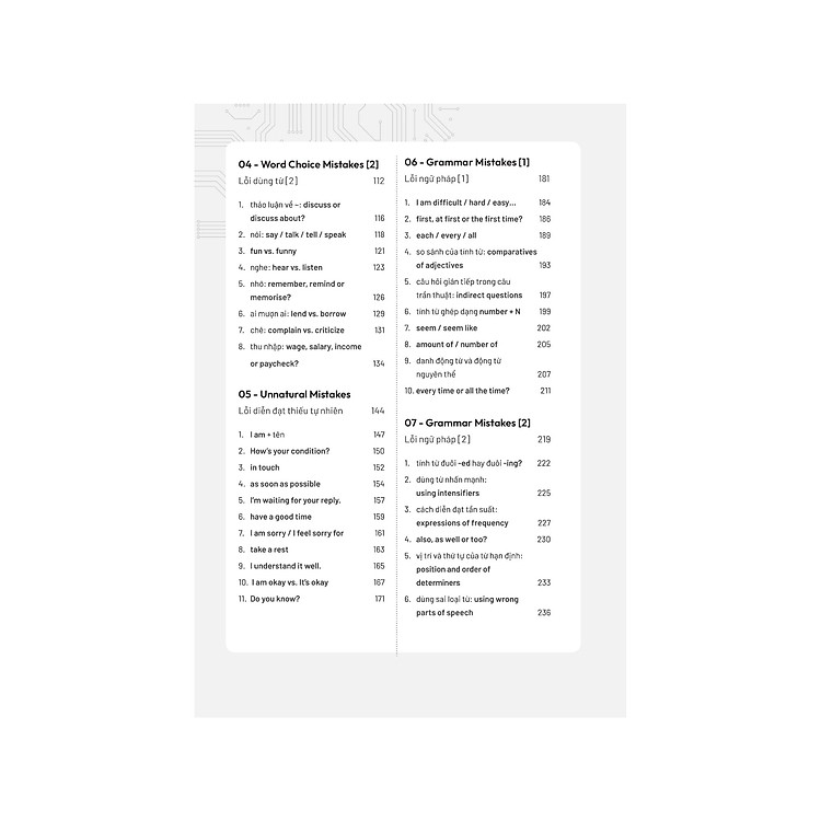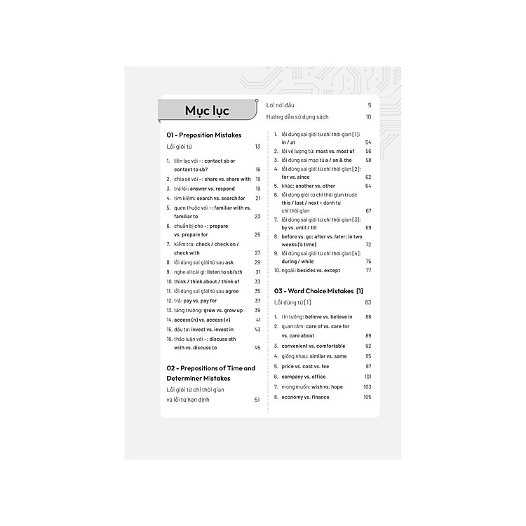 Sách được chia thành 10 chương, trong đó chương 1-9 tập trung vào các nhóm lỗi lớn mà người học tiếng Anh thường mắc phải, và chương 10 đưa ra các từ vựng tiếng Anh công sở phổ biến.