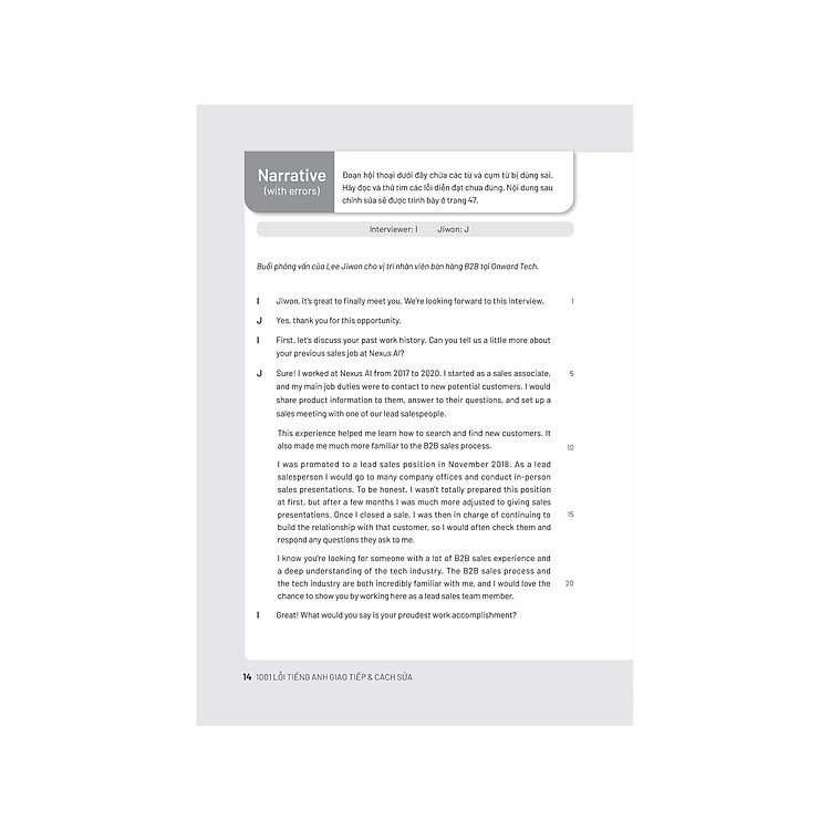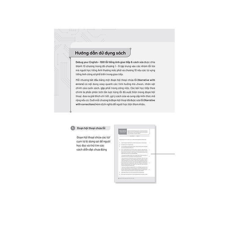 1001 lỗi tiếng Anh giao tiếp & cách sửa – Debug your English là cuốn sách tổng hợp các lỗi sai phổ biến mà người học tiếng Anh thường mắc và chia thành các nhóm lỗi lớn như lỗi dùng sai giới từ, lỗi ngữ pháp, lỗi dùng từ, lỗi diễn đạt thiếu tự nhiên. Từ các tình huống giao tiếp thực tế trong công việc, sách chỉ ra các lỗi sai và đề xuất cách sửa, giải thích sắc thái của từ, đồng thời cung cấp thông tin mở rộng và ví dụ ứng dụng.