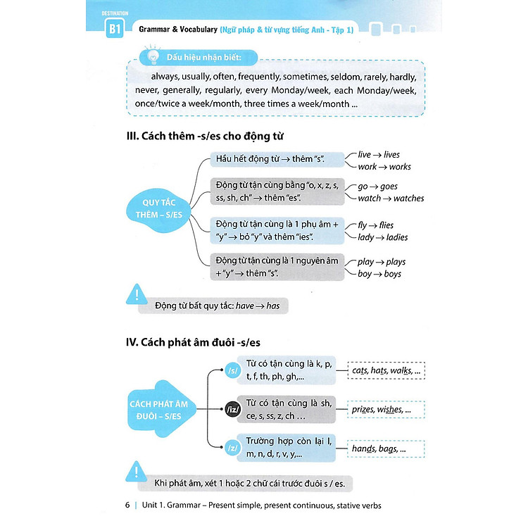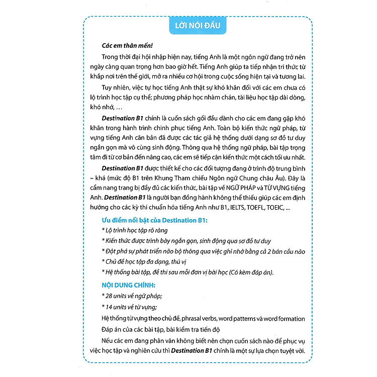 Destination B1 chính là cuốn sách gối đầu dành cho các em đang gặp khó khăn trong hành trình chinh phục tiếng Anh. Toàn bộ kiến thức ngữ pháp, từ vựng tiếng Anh căn bản đã được các tác giả hệ thống dưới dạng sơ đồ tư duy ngắn gọn mà vô cùng sinh động. Thông qua hệ thống ngữ pháp, bài tập trọng tâm đi từ cơ bản đến nâng cao, các em sẽ tiếp cận kiến thức một cách tối ưu nhất.