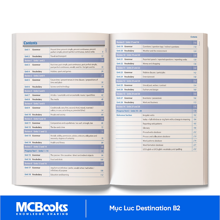 Toàn bộ 28 units của sách chia ra lần lượt phần Ngữ pháp và từ vựng đan xen nhau. Sau mỗi 2 units Destination B2: Grammar & Vocabulary sẽ cung cấp phần Preview 2 unit vừa học để các bạn ôn tập lại kiến thức vừa học. Điều này giúp các bạn nắm vững và nhớ lâu kiến thức.