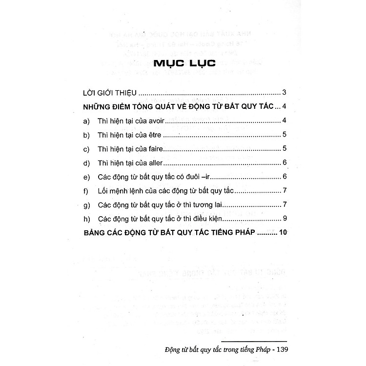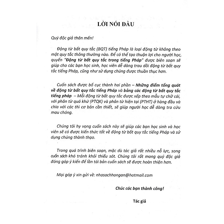 Chúng tôi hy vọng cuốn sách này sẽ giúp các bạn học sinh và học viên sẽ có được kiến thức tốt về động từ bất quy tắc tiếng Pháp và sử dụng chúng thành thạo.