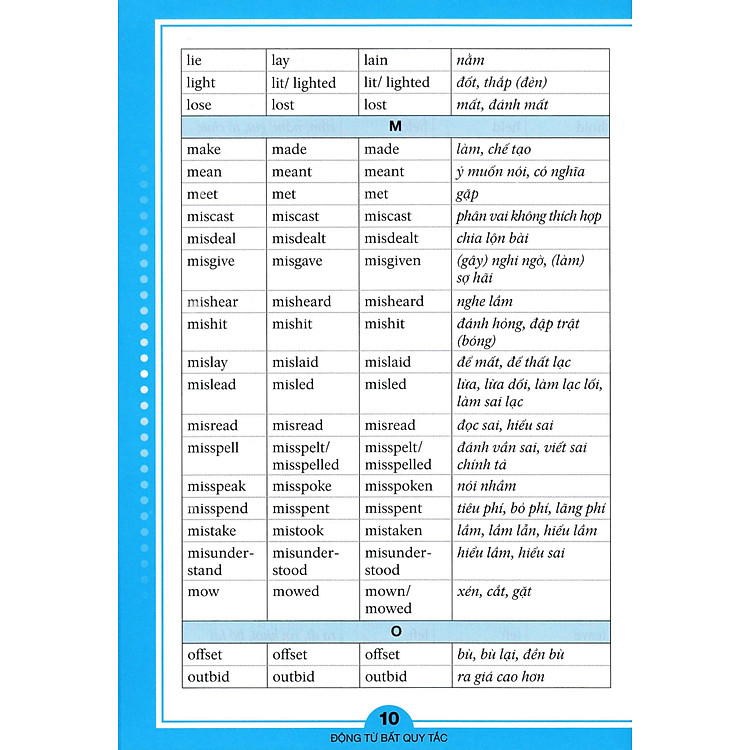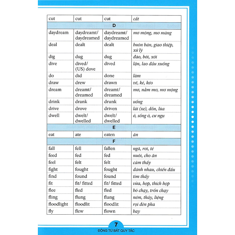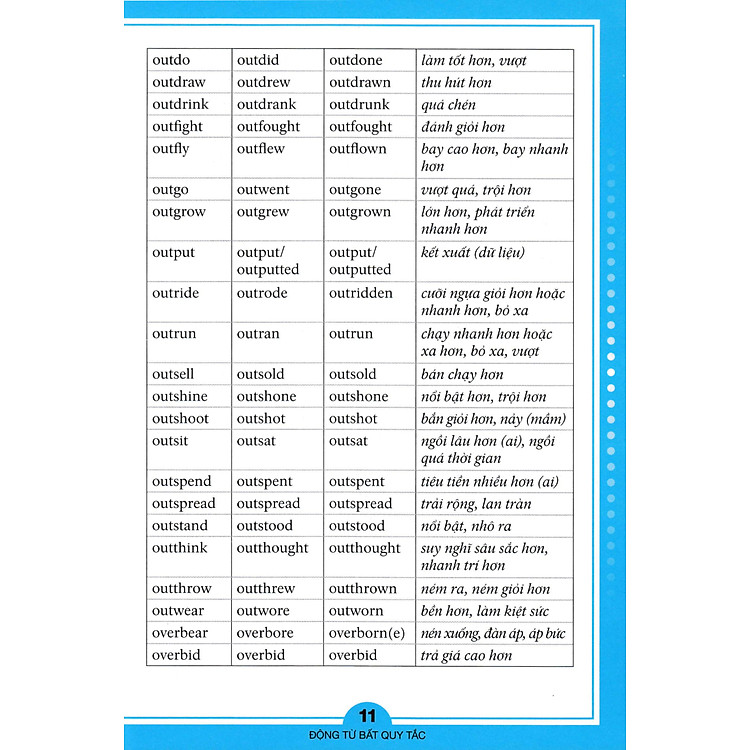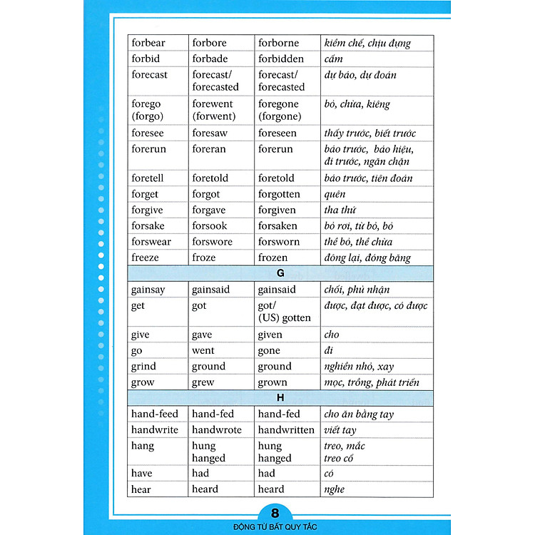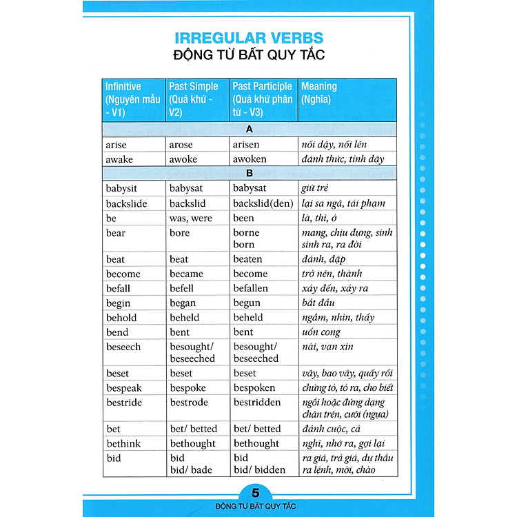 - Động từ bất quy tắc gồm bảng động từ bất quy tắc được chia theo 4: dạng hiện tại, quá khứ, quá khứ phân từ, hiện tại phân từ có kèm nghĩa của từ.