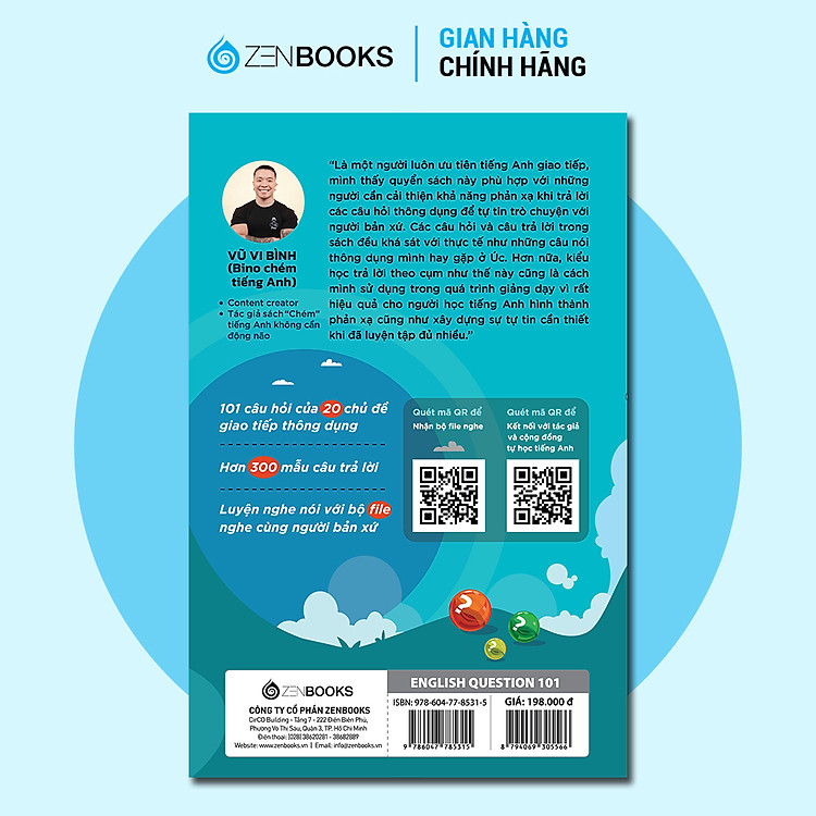 Lộ Trình Học Giao Tiếp Qua Q&A – English Question 101 (Zenbooks phát hành) là cuốn cẩm nang tự học nói tiếng Anh có nội dung khoa học, dễ hiểu và sát với thực tế, phù hợp với mọi đối tượng. Dù bạn mới tiếp cận với tiếng Anh hay đã học ngôn ngữ này từ lâu nhưng mãi vẫn chưa thể giao tiếp trôi chảy thì đều có thể bắt đầu với quyển sách này.