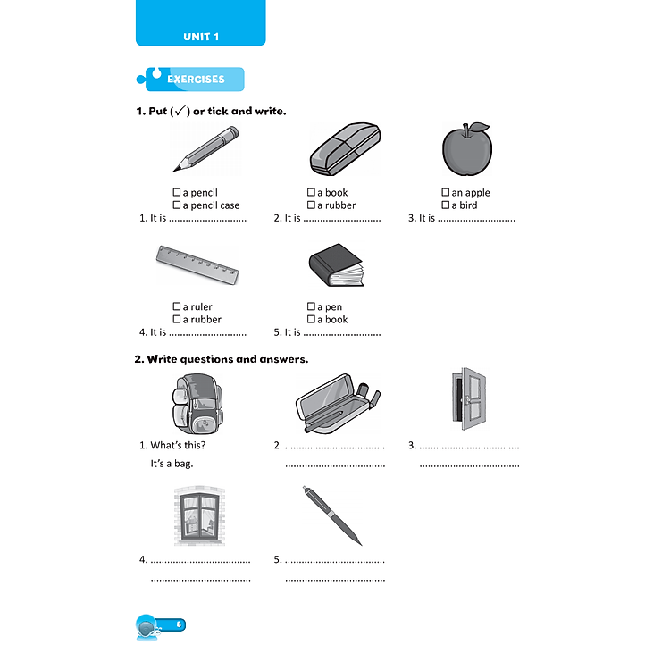 - Bao gồm hoạt động chọn từ đúng, điền từ, nối từ với hình ảnh và viết câu theo tranh.