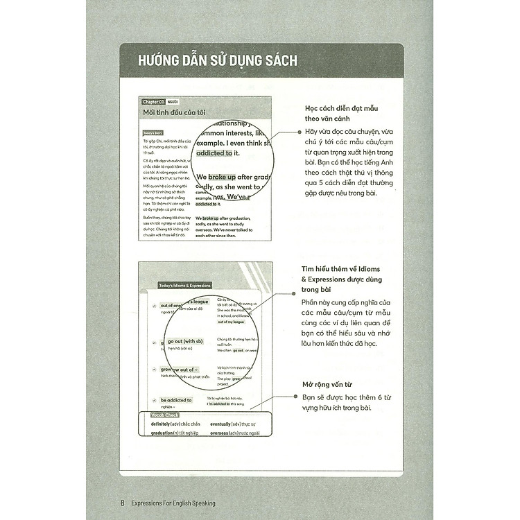 Expressions for English Speaking – 1 ngày 5 cụm 6 từ là cuốn sách giúp đối tượng học sinh, sinh viên học tiếng Anh làm giàu vốn từ vựng và củng cố các kiến thức ngữ pháp quan trọng. Sách bao gồm 135 câu chuyện dễ hiểu, gần gũi với cuộc sống, 675 cách diễn đạt hội thoại theo chủ đề tạo hứng thú cho người học, đồng thời giúp người học có thể giao tiếp đơn giản bằng tiếng Anh sau khi học. Các bài học sẽ có phần highlight những từ vựng/cấu trúc ngữ pháp cần ghi nhớ, giải thích ngữ nghĩa của câu kèm theo ví dụ minh họa cho từ. Cuối mỗi bài là phần mở rộng thêm các từ vựng mới.