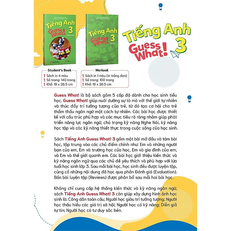 Không chỉ cung cấp hệ thống kiến thức và kỹ năng ngôn ngữ, Sách Giáo Khoa Tiếng Anh Guess What ! 3 còn giúp xây dựng hình ảnh học sinh là : Công dân toàn cầu ; Người học giàu trí tưởng tượng ; Người học thấu hiểu các giá trị xã hội ; Người học có kỹ năng ; Diễn giả tự tin ; Người học có tư duy sắc bén.