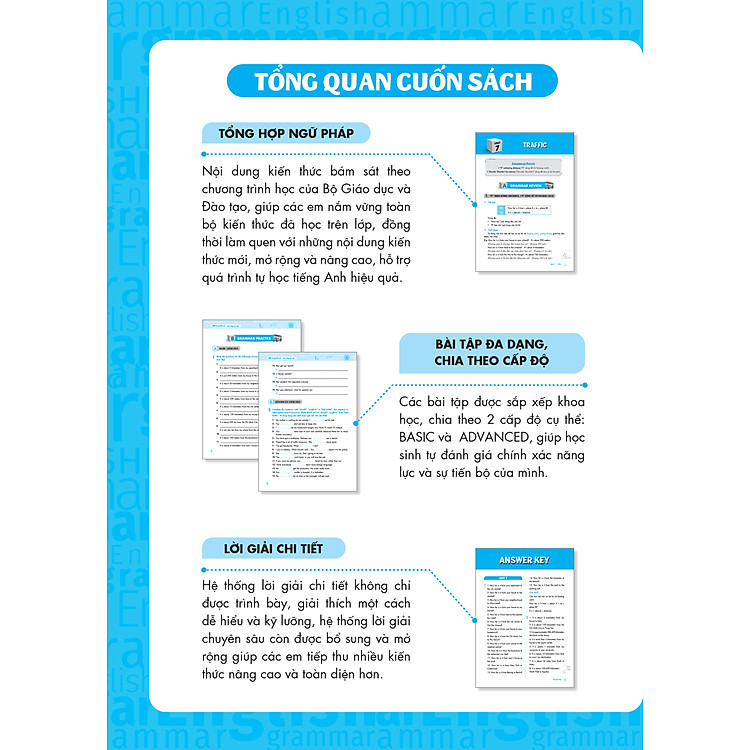 - Tổng hợp kiến thức ngữ pháp rõ ràng: Bám sát chương trình học của Bộ giáo dục và Đào tạo, giúp học sinh nắm vững kiến thức trên lớp.