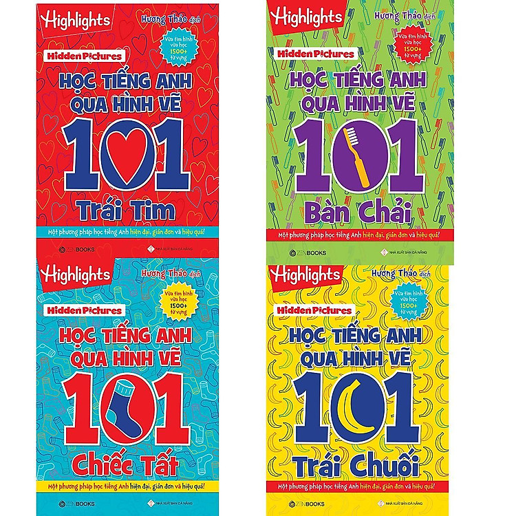 - Combo 4 cuốn sách “Hidden Pictures – Học Tiếng Anh Qua Hình Vẽ 101” gồm các chủ đề Trái Chuối, Chiếc Tất, Bàn Chải, Trái Tim.