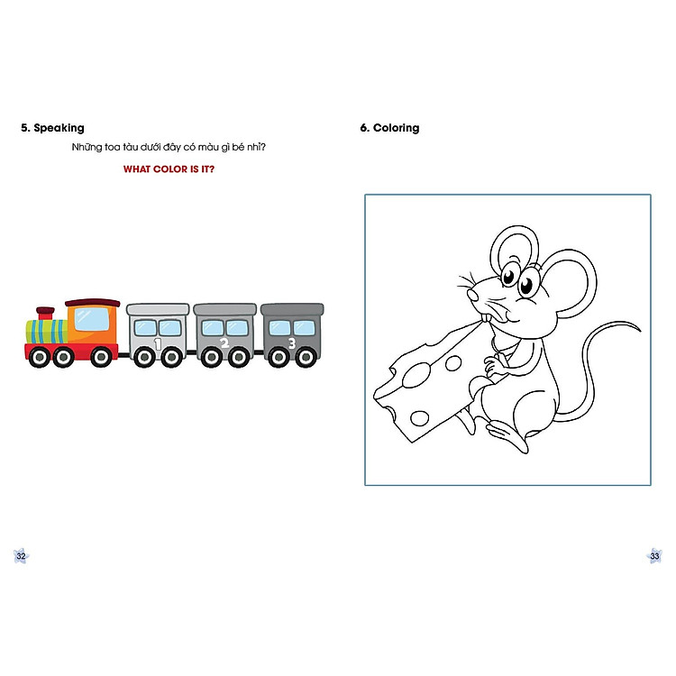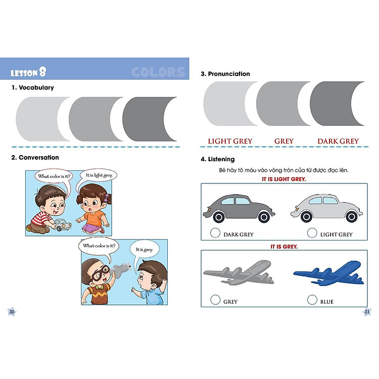- Cấu trúc bài học gồm 6 phần: Từ vựng, Hội thoại, Cách phát âm, Nghe, Nói, Tô màu.