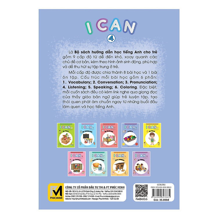 Bộ sách I CAN là bộ sách hướng dẫn học tiếng Anh cho trẻ gồm 9 cuốn từ cấp độ dễ đến khó, xoay quanh các chủ đề cơ bản: My bedroom, Colors, My body, My clothes, Food and drink, Farm animals, My family, kèm hình ảnh sinh động, phù hợp và dễ thu hút sự tập trung ở trẻ.