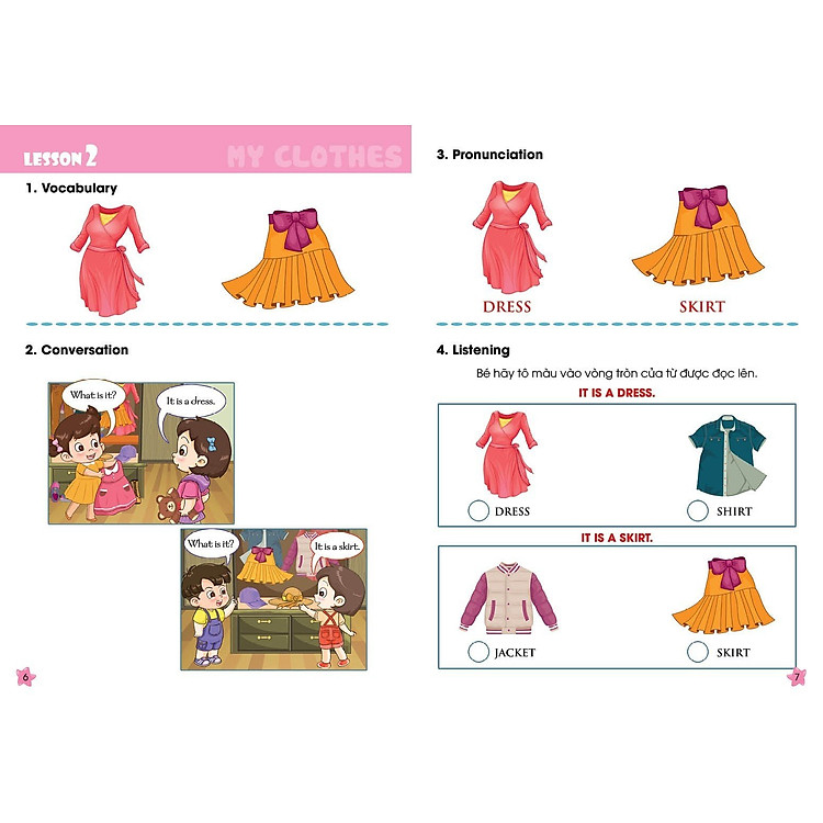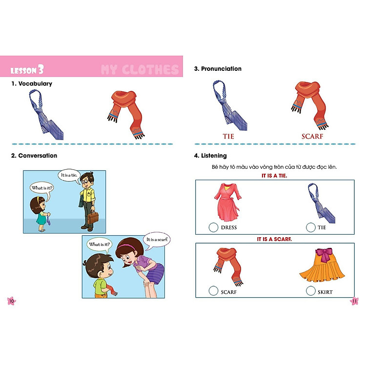 - Cấu trúc bài học bao gồm từ vựng, hội thoại, cách phát âm, nghe, nói và tô màu.