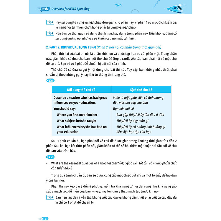 – Cung cấp kiến thức quan trọng và các bước làm bài cụ thể cho từng dạng bài IELTS Speaking.