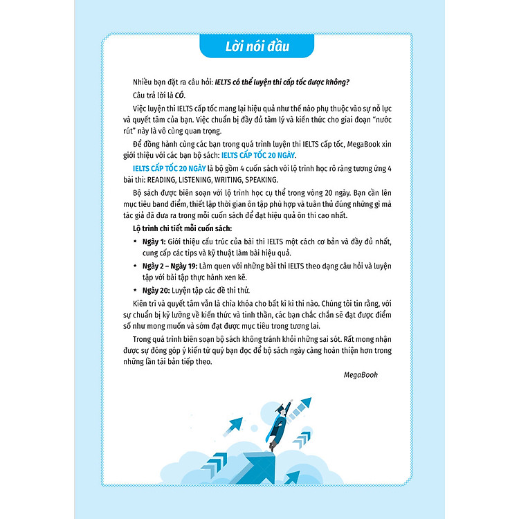 IELTS cấp tốc 20 ngày là bộ sách đầu tiên giúp bạn giảm 2/3 thời gian ôn thi cho kì thi IELTS. Bộ sách gồm 4 cuốn tương ứng với 4 bài thi: Reading, Listening, Writing và Speaking – được biên soạn với lộ trình học cụ thể trong vòng 20 ngày. Bạn cần lên mục tiêu band điểm, thiết lập thời gian ôn tập phù hợp và tuân thủ đúng những gì trong sách để đạt hiệu quả ôn thi cao nhất.