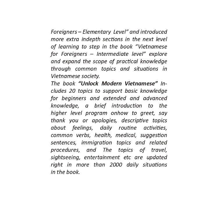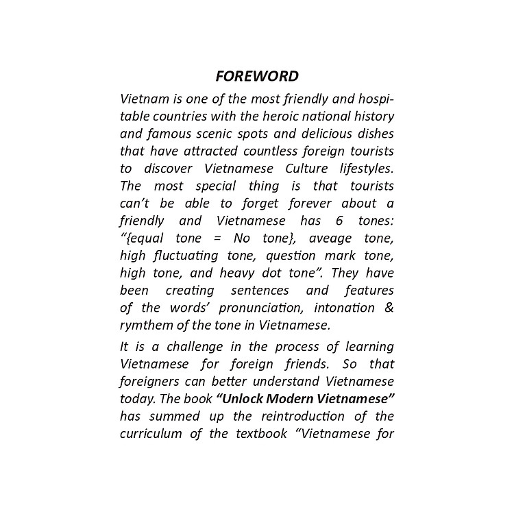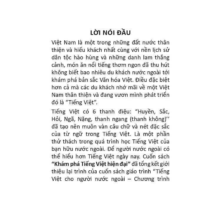 Việt Nam là một trong những đất nước thân thiện và hiếu khách nhất cùng với nền lịch sử dân tộc hào hùng và những danh lam thắng cảnh, món ăn nổi tiếng thơm ngon đã thu hút không biết bao nhiêu du khách nước ngoài tới khám phá bản sắc Văn hóa Việt. Điều đặc biệt hơn cả mà các du khách nhớ mãi về một Việt Nam thân thiện và đang vươn mình phát triển đó là “Tiếng Việt”. Tiếng Việt có 6 thanh điệu: “Huyền, Sắc, Hỏi, Ngã, Nặng, thanh ngang (thanh không)’’ đã tạo nên muôn vàn câu chữ và nét đặc sắc của từ ngữ trong Tiếng Việt. Là một phần thử thách trong quá trình học Tiếng Việt của bạn hữu nước ngoài. Để người nước ngoài có thể hiểu hơn Tiếng Việt ngày nay. Cuốn sách “Khám phá Tiếng Việt hiện đại” đã tổng kết giới thiệu lại trình của cuốn sách giáo trình “Tiếng Việt cho người nước ngoài – Chương trình sơ cấp” và giới thiệu các phần chuyên sâu hơn trong cấp độ tiếp theo của cuốn sách “Tiếng Việt cho người nước ngoài – Chương trình Trung cấp” và khám phá cùng mở rộng phạm vi kiến thức thực tế qua các chủ đề và tình huống thông dụng trong xã hội Việt Nam.