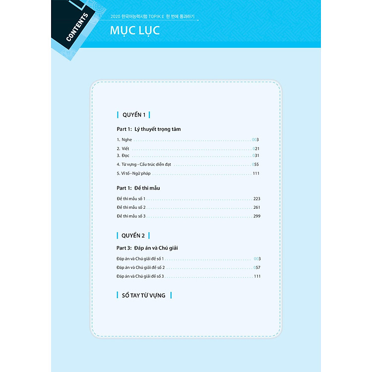 - Có “Sổ tay từ vựng” TOPIK với 3 ngôn ngữ Hàn, Anh, Việt độc quyền trong giáo trình.