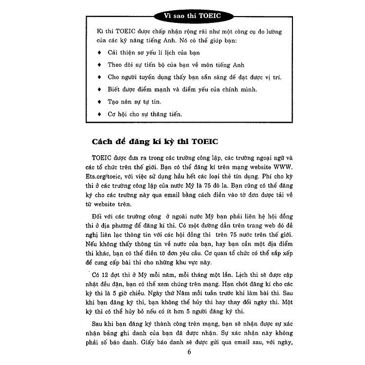 Sách là tập hợp đủ 4 phần thi cho bài thi TOEIC, bốn kỹ năng tập hợp đầy đủ trong 1 quyển sách giúp người học ôn luyện 1 cách hệ thống. Các dạng bài tập của từng kỹ năng được chia phần cẩn thận, mỗi phần lại có hướng dẫn chi tiết, cụ thể. Điểm trừ của sách là chất lượng in không được đẹp và và rõ nét cho lắm, vì sách in màu đen trắng nên các hình ảnh không được sinh động và bắt mắt. Sách thích hợp cho cả việc đi dạy lẫn việc người học tự ôn