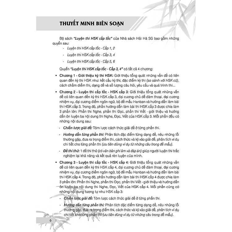 Để đạt mục tiêu “cấp tốc” đã giải thích ở trên, chúng tôi dựa vào Đề cương và Đề thi mẫu của HANBAN, cũng như những tài liệu luyện thi HSK tốt nhất của Trung Quốc để biên soạn bộ sách này. Từng phần của bài thi được giới thiệu qua một cấu trúc thống nhất như sau: