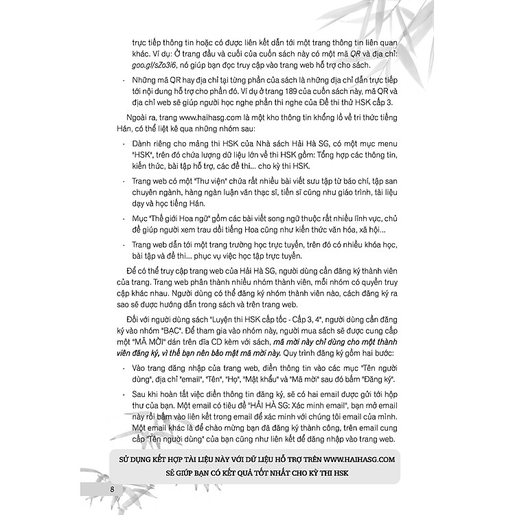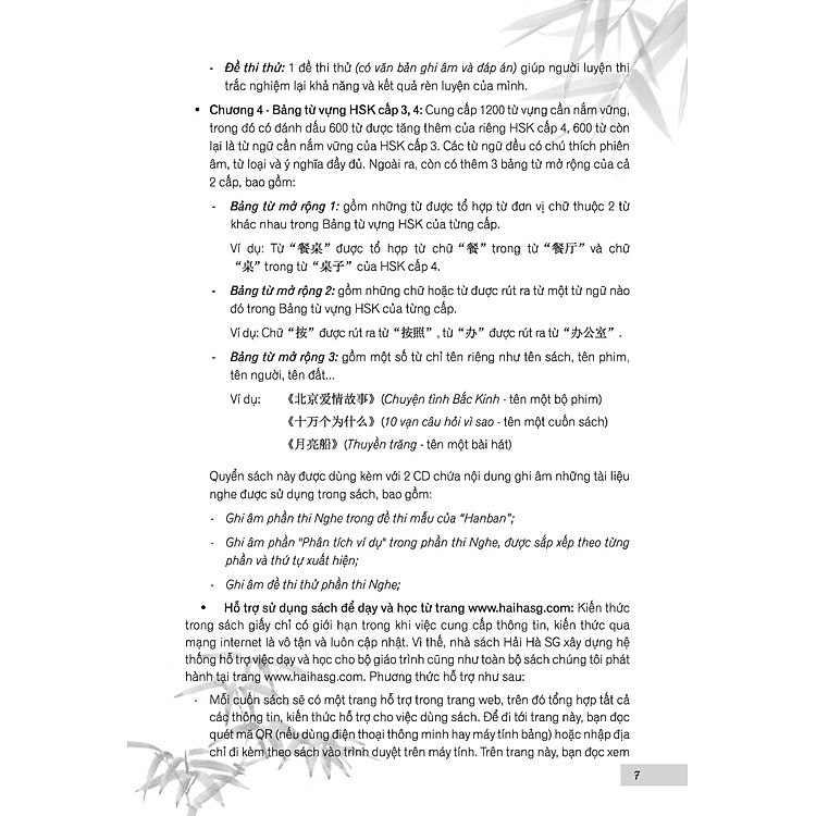 • Trang web chúng tôi có tính năng học trực tuyến thông qua các khóa học. Đối với người dùng bộ Luyện thi HSK cấp tốc này, người học sẽ có cơ hội làm thử một vài bài thi HSK trực tuyến, qua đó giúp người học có sự chuẩn bị thật tốt cho kỳ thi thực tế. Tuy nhiên, do khối lượng công việc khá lớn nên tính năng này chưa hoàn tất vào lúc phát hành bộ sách này. Chúng tôi sẽ làm nhanh nhất để nó mau chóng đến được với bạn đọc.