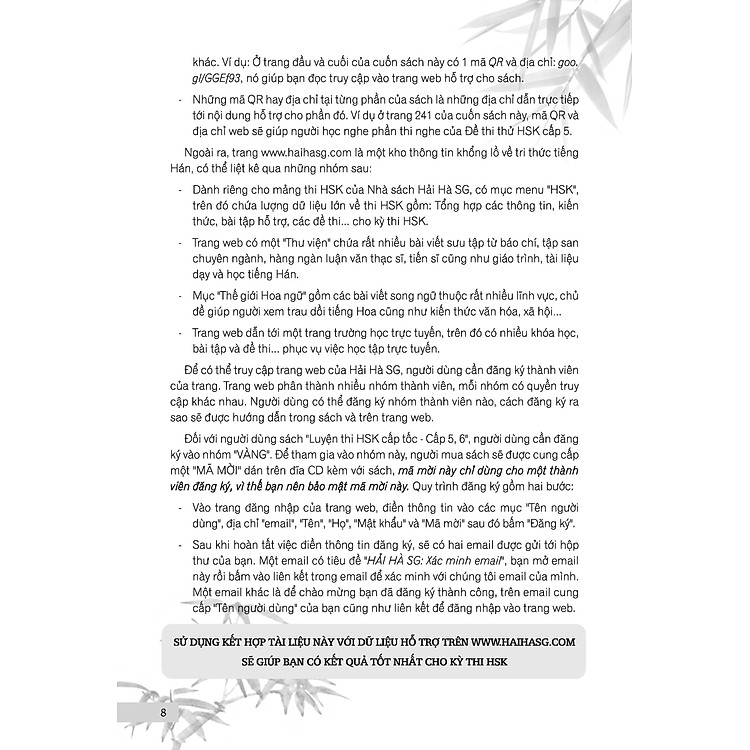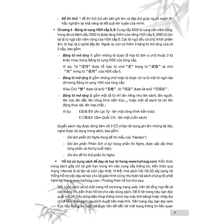 • Trang web chúng tôi có tính năng học trực tuyến thông qua các khóa học. Đối với người dùng bộ Luyện thi HSK cấp tốc này, người học sẽ có cơ hội làm thử một vài bài thi HSK trực tuyến, qua đó giúp người học có sự chuẩn bị thật tốt cho kỳ thi thực tế. Tuy nhiên, do khối lượng công việc khá lớn nên tính năng này chưa hoàn tất vào lúc phát hành bộ sách này. Chúng tôi sẽ làm nhanh nhất để nó mau chóng đến được với bạn đọc.