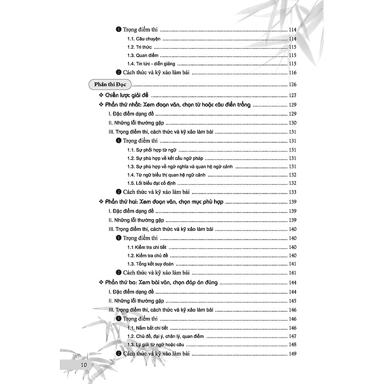 III. Trọng điểm thi, cách thức và kỹ xảo làm bài: Đây là phần quan trọng nhất của tài liệu Phần trọng điểm thi giới thiệu những trọng tâm mà dạng đề thi tập trung vào. Liên quan đến trọng điểm thi này, chúng tôi đã hệ thống hóa các điểm ngôn ngữ, công thức hóa các cấu trúc ngữ pháp cũng như tập hợp các từ ngữ có liên quan.