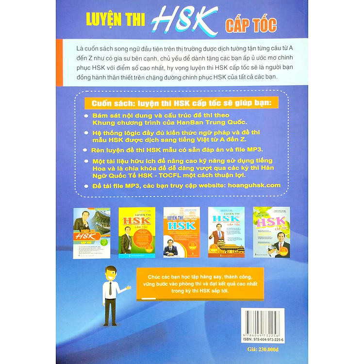 Bộ sách Luyện thi HSK cấp tốc không chỉ là tài liệu giảng dạy hữu ích ở các trung tâm dạy tiếng Hoa mà còn rất thích hợp với những người đang ấp ủ ước mơ chinh phục HSK trong khoảng thời gian ngắn nhất, với điểm số cao nhất.