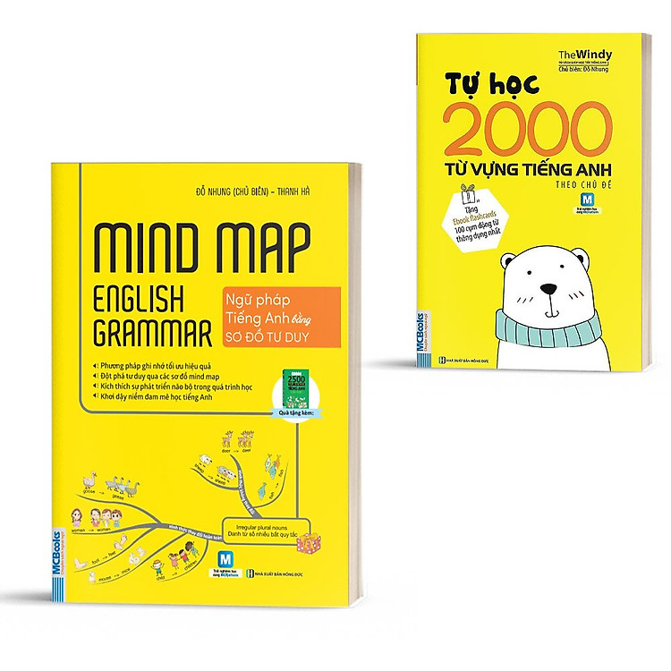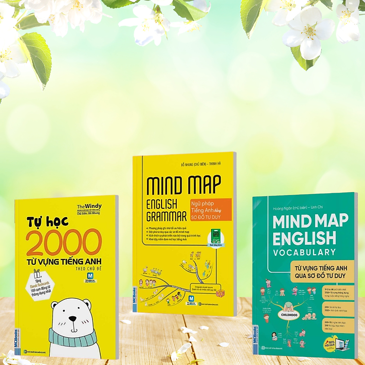 - Combo bao gồm 3 cuốn sách: Mindmap English Grammar, Mindmap English Vocabulary và Tự học 2000 từ vựng tiếng Anh.
