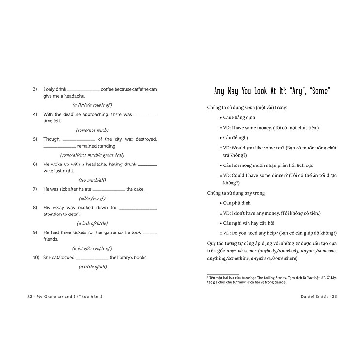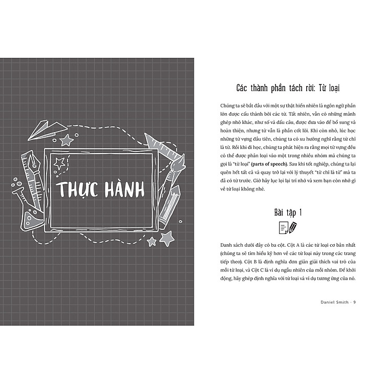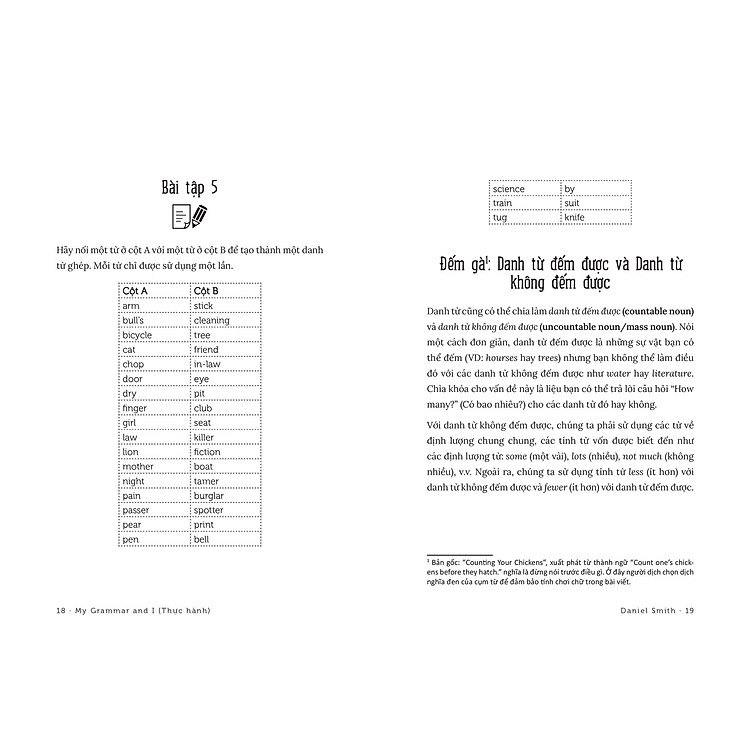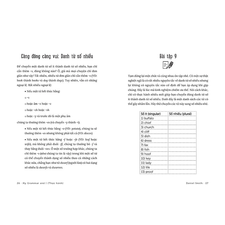 Vì chúng tôi tin rằng, sẽ chẳng có thứ ngôn ngữ nào chỉ cần học hết lý thuyết thôi đã có thể sử dụng thành thạo như người bản ngữ, tiếng Anh lại càng không phải là ngoại lệ. Với mong muốn mỗi dòng kiến thức bạn từng đọc qua sẽ không dễ dàng trôi tuột khỏi đầu, tác giả đã soạn nên cuốn sách đấy ắp những bài tập nghiêm-túc-mà-hài-hước này. Mỗi lượng kiến thức được đưa ra trong My Grammar And I – Thực Hành (Hay là “Me” đúng không nhỉ?) sẽ kèm theo nhiều bài tập tương ứng, để bạn có thể củng cố kiến thức ngay lập tức chỉ với cây bút chì trong tay.