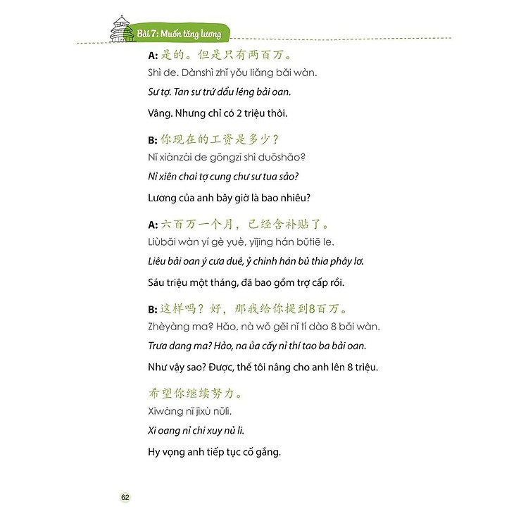 Ngoài việc cung cấp những mẫu câu giao tiếp hàng ngày (bao gồm phần chữ Hán, phiên âm chuẩn quốc tế, phần âm mô phỏng bằng tiếng Việt – âm bồi, phần dịch nghĩa), cuốn sách còn đưa ra rất nhiều công thức ngắn gọn với giải thích đơn giản, dễ hiểu, cùng hệ thống từ mới theo chuyên ngành giúp người học có thể vận dụng kiến thức một cách linh hoạt trong công việc và cuộc sống.