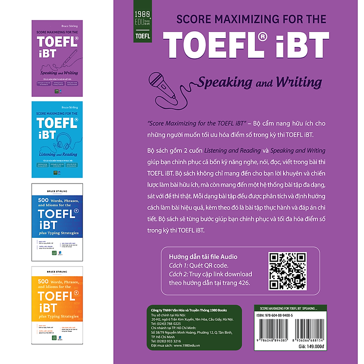 “Score Maximizing for the TOEFL iBT – Speaking and Writing” là một trong những cuốn sách nổi tiếng trên toàn thế giới và tại Việt Nam được biên soạn bởi giáo sư Bruce Stirling.
