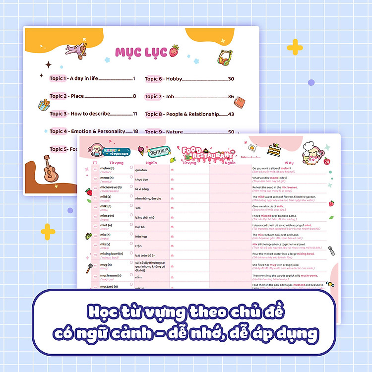 Chia theo 9 chủ đề thực tế, gần gũi: Các chủ đề như “A day in life”, “Emotion & Personality”, “Job”, “Food & Restaurant”… đều quen thuộc, giúp người học dễ hình dung và vận dụng từ vựng vào cuộc sống hàng ngày.