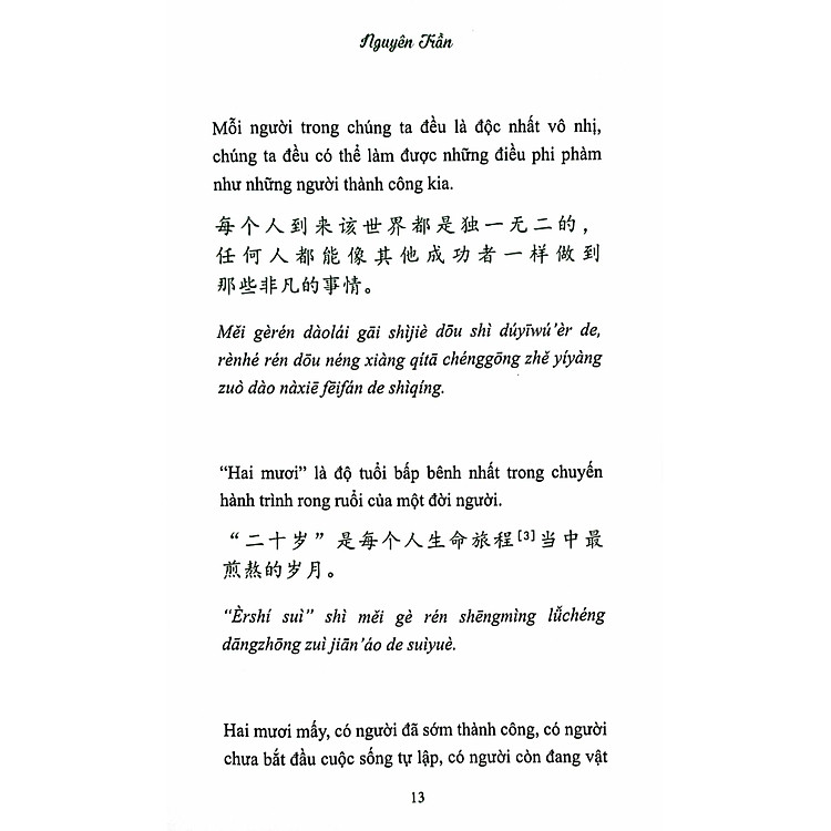Được viết bằng tất cả tâm huyết và sự thấu cảm của tác giả Nguyên Trần – thầy giáo dạy tiếng Trung giàu kinh nghiệm, cuốn sách tản văn song ngữ Việt – Trung “Tản mạn về tuổi 20” sẽ bổ trợ rất nhiều cho những ai đang học tiếng Trung, đặc biệt là với những ai theo đuổi lộ trình HSK.
