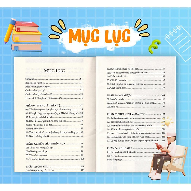 - Nội dung chia thành 6 phần: Lý thuyết tiền tệ, Kiếm tiền nhiều hơn, Chi tiêu, Vay mượn, Tiết kiệm và đầu tư, Kế hoạch.